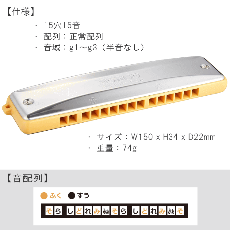 【TOMBO(トンボ) 教育用ハーモニカ シングルハーモニカ 15穴 NO-1215K ■商品説明 幼稚園、小学校低学年用として教科書にマッチした最も小型(15穴)のハーモニカです。 2オクターブの音域で、音配列は正常配列を採用しています。 お子様や、またハーモニカ初心者の方にオススメです。 なお、22穴の商品「NO-1222」には本体にひらがなで「どれみ・・・」と表記がございますが、 本商品15穴には表記がなく、ドの音の部分への目印だけとなります。 音数が多く、表記があるものをご希望の場合には、「NO-1222」をオススメ致します。 TOMBO(トンボ) 教育用ハーモニカ NO1215K 品番:NO-1215K ●型番:NO1215K ●音域:g1〜g3(半音なし) ●15穴15音 ●正常配列 ●サイズ:148×33×22mm ●重量:約60g■商品説明 幼稚園、小学校低学年用として教科書にマッチした最も小型(15穴)のハーモニカです。 2オクターブの音域で、音配列は正常配列を採用しています。 お子様や、またハーモニカ初心者の方にオススメです。 なお、22穴の商品「NO-1222」には本体にひらがなで「どれみ・・・」と表記がございますが、 本商品15穴には表記がなく、ドの音の部分への目印だけとなります。 音数が多く、表記があるものをご希望の場合には、「NO-1222」をオススメ致します。 TOMBO(トンボ) 教育用ハーモニカ NO1215K 品番:NO-1215K ●型番:NO1215K ●音域:g1〜g3(半音なし) ●15穴15音 ●正常配列 ●サイズ:148×33×22mm ●重量:約60g
